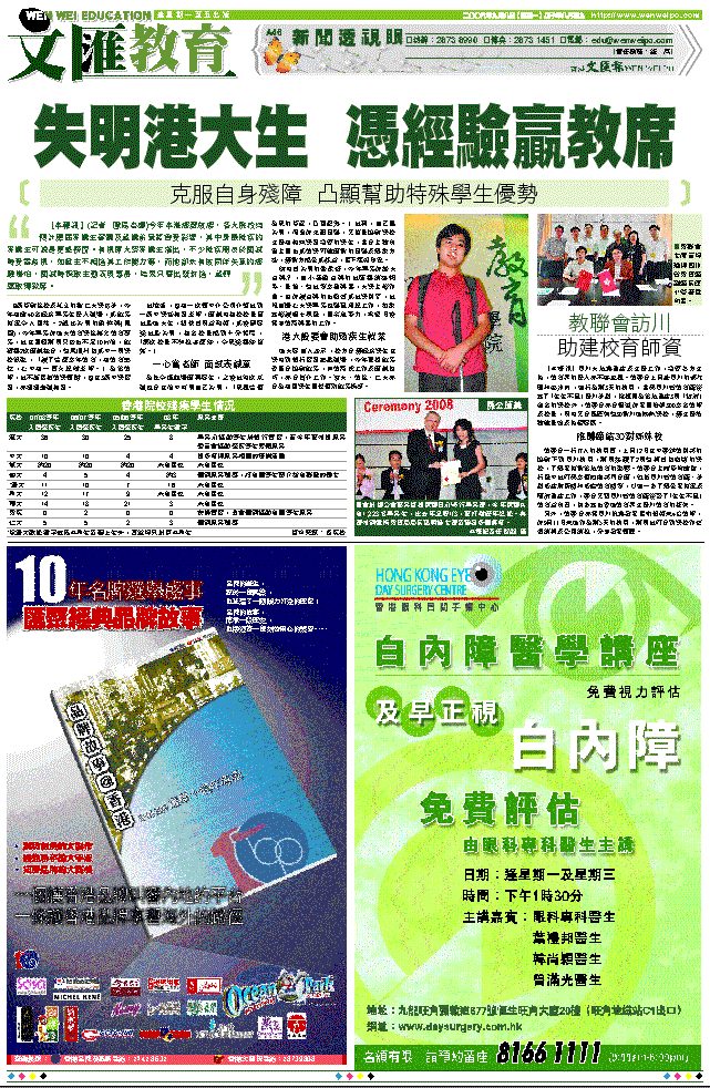8所資助院校及私立的樹仁大學估計,今年有逾40名殘疾畢業生投入職場,其就業情況令人關注。2歲起失明的游偉樂(見圖),今年畢業於港大教育學院英文教育專業,他在暑假期間只寄出不足10封信,就獲得2次面試機會,結果順利被其中一間學校錄取,「讀了這麼多年教育,有教育熱忱,心中有一團火想做老師。」為當教師,他不斷累積教學經驗,曾在3所中學實習,亦頻頻兼職補習。