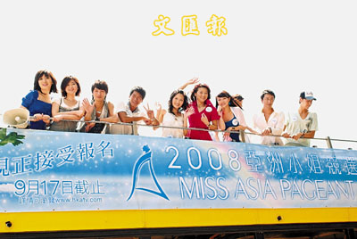 【本報訊】(記者 李慶全)亞視昨日舉行花車巡遊活動,為十二月舉行的「2008亞洲小姐」選舉宣傳,第一屆亞姐黎燕珊、應屆亞姐孫辰和吳芳、藝員吳亭欣、珈穎等一同參與,活動由亞視大埔總台出發,乘坐通天雙層巴士途經沙田、旺角及尖沙咀等多個地點派報名表作招募。