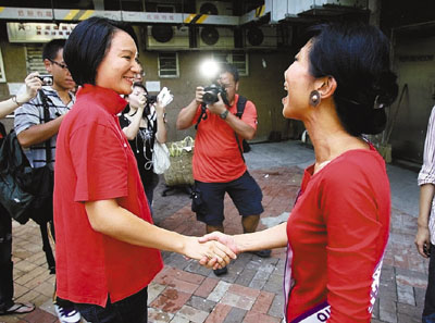 ■李慧鄐簼s靜兩個不同政見的候選人,不約而同穿紅衫出陣。本報記者梁祖彝 攝