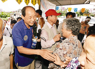 ■張學明與發叔(紅帽者)一起下鄉,爭取鄉民的支持。 本報記者劉國權 攝