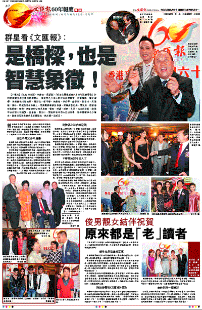 華哥專程從內地趕返港出席酒會,他說畢竟60周年是難得的日子,希望繼續再有60年,雖然60歲已有皺紋,無疑也是智慧象徵。任達華是《文匯報》20多年的支持者,尤其他經常往返內地,本報便像他的資料庫,他覺得各個版面做得不錯,特別欣賞娛樂版和體育版。說到改善之處,他認為最好增加多些內地財經和國際性消息,又覺得本報與其他報紙風格有別,記者朋友都很純樸,不會刻意製造是非,十分正派。華哥興奮地說:「《文匯報》可說是我快樂泉源,也是國內寶庫和中港通,令我獲益不淺。」