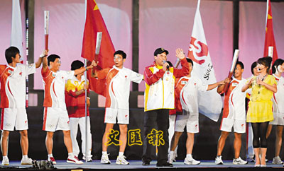 ■中國羽毛球隊總教練李永波在開幕式上演唱奧運歌曲。 新華社