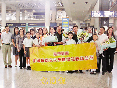 由教育界20個團體組成的「香港教育界支援四川災區重建聯席會議」最近趁「敬師日」期間,邀請「全國抗震救災英雄模範教師代表團」的4位老師來港訪問,各人昨日早上抵港。香港教育工作者聯會黃楚標學校師生前往接機。持花者左起:周汝蘭、周德祥、董雪峰、劉亞春有英雄模範教師之稱,其中周汝蘭在地震發生期間4次衝返課室搶救學生,令全班52名幼兒全部脫險,令人敬佩。