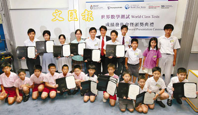 世界數學測試於04年引進香港,今年4月舉行的測試有來自246間中小學、超過2,669人次港生參加。測試分8至11歲組及12至14歲2組,內容亦分數學及解難分析。題目由英美澳著名大學教授設計,未滿12歲學童可越級挑戰12至14歲組別測試。