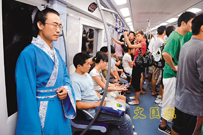 復古可以引發商機,同樣可以帶來爭議。北京地鐵早前出現一名身穿藍色仿古漢服的男子,他將頭髮盤成髮髻,造型完全是一個古代書生,只是臉上多了一副眼鏡。這身打扮與周圍的環境格格不入,但他若無其事,還大模大樣地在地鐵裡看書,惹來不少乘客異樣目光和議論。