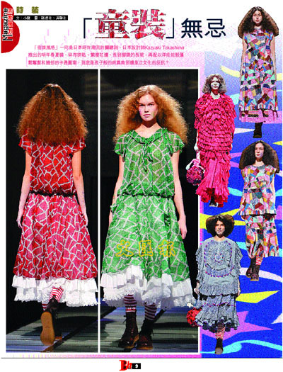 「街頭風格」一向是日本時尚潮流的關鍵詞,日本設計師Kazuaki Takashima推出的明年春夏裝,碎布拼貼、繁複花邊、長到腳踝的長裙,再配以洋娃娃般蓬鬆鬈髮和臉部的卡通圖案,到底是孩子般的純真無邪還是次文化的反抗?