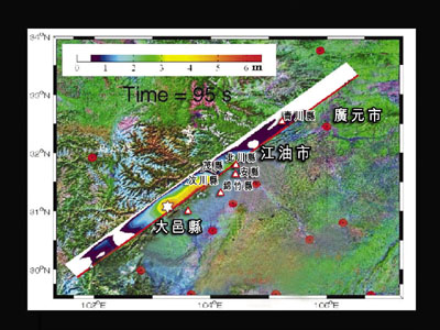 圖中所示為地震發生後95秒的震動情況,斜紅長線為板塊斷層位置,顏色為地震破裂程度。圖中白色的位置受震程度較輕,而該數處均為地下天然氣開採地,壓力較低。