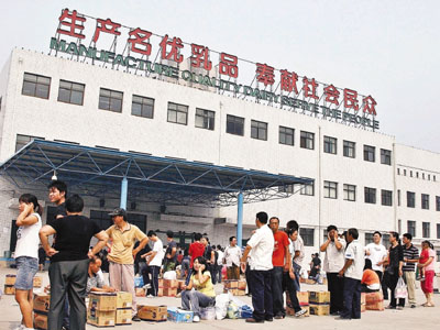 ■家長在三鹿集團門外等待退貨,上方「生產名優乳品,奉獻社會民眾」的口號極具諷刺。 路透社