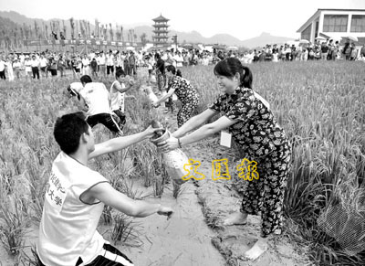 16日,江西省宜春市明月山天工開物園景區舉行全國農耕健身大賽,來自江蘇、浙江、四川、福建等省市的健身代表隊及大學院校代表隊參賽。圖為選手們進行稻田抓魚比賽。 新華社