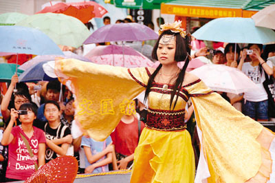 近日,儘管下著雨,但此間正在舉行的福州中秋廣場廟會依然人氣旺盛。觀眾冒雨欣賞動漫秀表演《長安幻夜》。 中新社