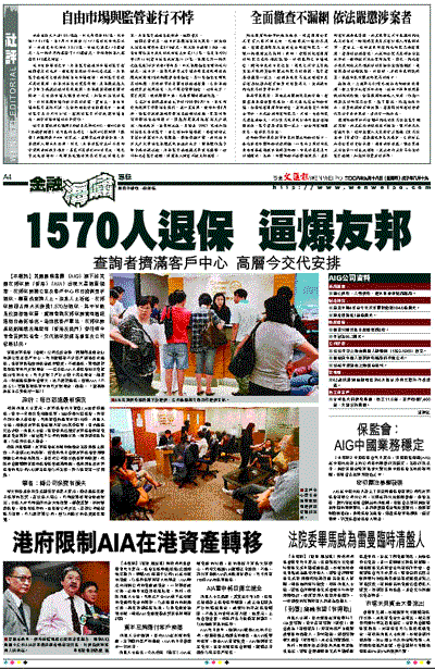 政府消息人士表示,友邦保險前日接獲1,400多份退保,當中一半是投資相連保單,500份是分紅保險,另有小部分是人壽保險;昨早接獲的退單亦有170份。消息人士指,相對於友邦保險在港共有195萬份保單,目前退保只佔少數。消息人士說,監管當局已規定友邦保險所有資產及資金轉換,包括轄下公司的關連交易,須得到保監批准,以保障投保人權益。