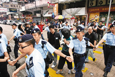 新界南總區重案組探員押解姓葉疑犯,昨午12時到達九龍城,同行有一名男手語專家,一隊藍帽子預早封鎖多間與案情有關的店舖。疑犯用黑布袋蒙頭,身繫鐵鏈,在大批警方人員簇擁下,首先到南角道一間家庭用品店,由探員盤問有關買生果刀和膠砧板的過程,手語專家即場翻譯,科學鑑證科人員在旁拍攝存檔。