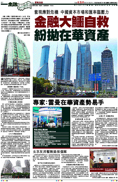 有消息顯示,申請破產的雷曼正在為自己的中國業務尋找「下家」,換取資金自救。美國國際集團(AIG)也打算通過出售資產的方式來籌集營運資金,其中中國壽險經營權已列入打包出售的清單。