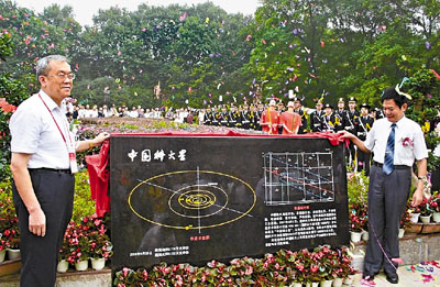 ■20日,龔惠興院士(右)為「中國科大星」紀念碑揭幕。國家天文台將1996年9月20日即科大校慶日發現的小行星命名為「中國科大星」。 中新社