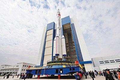 ■神七船箭塔組合體垂直轉運始發現場。新華社