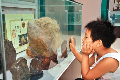 9月20日,在河北省古韻文化廣場舉行的「河北古韻紫砂、奇石博覽會」上,一位小朋友被台灣的「魔髮石」深深吸引。 中新社