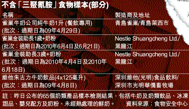 不含「三聚氰胺」食物樣本(部分) (圖)