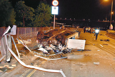 至昨凌晨零時27分,亡命飛車駛至深井汀蘭居對開青山公路,爬頭欲超越前面的士,但車頭撞上的士左尾部,全車失控剷上路中安全島,反彈狂撞左邊行人路和路牌,全車反轉四輪朝天,車頂壓扁,前後擋風爆裂,四個車輪撞至彎曲,車內兩人頭爆重傷被困。