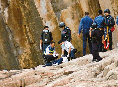 【本報訊】一對男女,昨結伴到西貢萬宜水庫遠足時,於東壩破邊洲一處逾100米高的懸崖下岸邊岩石上,發現一名男子身體扭曲、昏迷不醒,馬上報警。警方及救護員乘小艇趕往現場,飛行服務隊亦派出直升機協助接載飛行醫生到場施救,惜證實傷者經已死亡。水警事後利用小艇將死者的遺體送上警輪,轉送西貢對面海水警基地調查,因其身上並無任何身份證明文件,需進一步確定身份,初步了解後相信無可疑之處。
