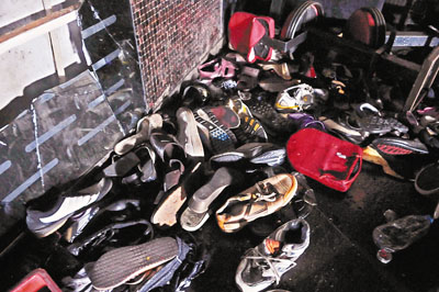 ■深圳龍崗舞王俱樂部特大火災事故,人群逃生時相互踩踏,造成43死88傷。圖為逃生者的鞋散布通道。 中通社