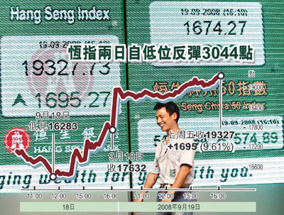 美國政府的一連串救市措施,刺激道指上周五大漲368點,收於11,388點;昨天晚上,中國證監會又公布放鬆上市公司股票回購的管制,無疑為A股再注強心針。市場人士預計,今日港股料隨外圍高開700點,加上本周美國政府救市方案很大機會獲國會通過,港股有力上試20,500點,升穿20,800點後,有機會上試21,600點。