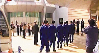 ■六名航天員進駐公寓。電視台的畫面特意沒有拍攝正面,使最終上天究竟是哪三人留下了懸念。 電視截圖