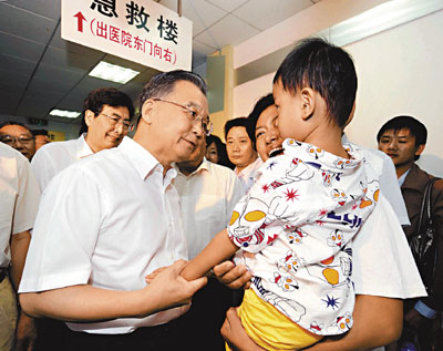 聽說兒童醫院「人休機不休」,抓緊篩查患兒,溫家寶希望醫護人員不漏過一例患兒,對群眾負責;檢查出患病的孩子,一定要抓緊治療。他表示,發生這樣的事情,我心裡感到很不安,群眾著急,醫生著急,我們也著急。我們要竭盡全力給孩子們檢查,這樣大家才能放心。