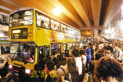 ■八號波即將掛,鵝頸橋底巴士站擠滿了歸心似箭的市民。 本報記者潘達文 攝