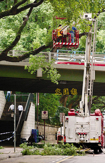 在八號暴風信號下,康文署至昨晚8時共收到3宗塌樹報告,分別位於奧運站海庭道、加士居道近拔萃女書院和荔枝角近欽州街。