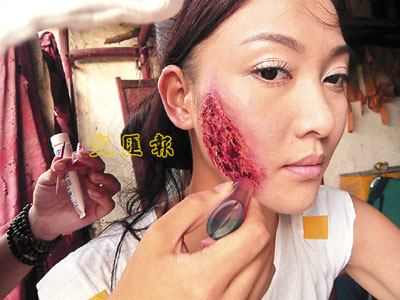 李彩華(Rain)日前於橫店拍攝電視劇《天地不容》,阿Rain親身上陣拍火燭戲、更遭火燒爛面。火把就在Rain的頭後、面前掠過,是她入行以來最近接觸火的一次。她說:「雖然每一次火把都只是快高速掠過,因為很熱,感覺很貼近、似乎快要燒到頭髮,所以始終有點驚,但工作人員都是做足安全的。」這場戲火燒了她的家,也燒傷了臉,所以後面的戲份要化上特技妝。臉上大大的一道疤痕,每次拍攝都要多花兩個小時化妝,拍足全日。Rain說:「我還是第一次在臉上化這種妝,化妝師用膠水一層一層將爛肉、結焦黏上去。看上去真的幾恐怖,我自己照鏡都有點毛管棟!但我很高興有機會演出這種有突破的角色,這角色不是裝醜女,而是遇上不幸,對我來說燒傷後的內心戲才是真正的突破。」因為皮膚敏感,當晚Rain的臉上長出點紅,幸好看醫生後已沒問題。