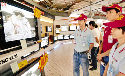 ■27日,海口市民在海口市一家超市觀看航天員出艙活動。 新華社