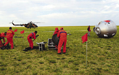 ■9月27日,迎接神七完成任務返回地面的工作人員,在預定降落地點附近進行返回艙搜救模擬演練。 中新社