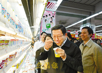 26日下午陳德銘考察了北京的奶產品儲備和供應情況。在一家普通超市中,他還專門品嚐了某國產品牌的酸奶。