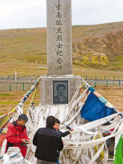 據悉,為制止日益猖獗的非法盜獵、淘金活動,科學合理地開發可可西里,1992年在治多縣委副書記索南達傑的領導下,成立治多縣西部工作委員會,破獲了多宗盜獵案。1994年1月18日,索南達傑在可可西里太陽湖畔與盜獵分子的鬥爭中壯烈犧牲。為了紀念這位藏羚羊的保護神,人們將可可西里第一座藏羚羊保護站命名為索南達傑保護站,並在自然保護區的入口──崑崙山口為索南達傑建造一座紀念碑,上面鑲嵌著索南達傑的遺像。當天,兩岸學生向索南達傑像獻上哈達,向這位英雄致以深深的敬意。