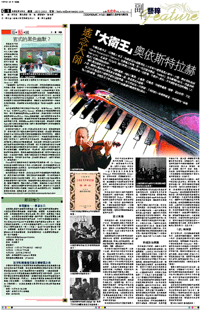 至於在京給民間的三場演出,由於門票定價八毫至兩元,旋即售罄,最後再加演一場。其時中國提琴和演藝事業仍嫩,但奧氏並無因此敷衍了事,反而與鋼琴拍擋楊波爾斯基 (Yampolsky)演出與國際標準無異的獨奏會,其中還背譜演奏馬思聰著名的《思鄉曲》,令在場的作曲家感動不已。他還和中央樂團演奏莫扎特第五協奏曲,由剛從蘇聯回國的李德倫指揮。之後亦和中央歌劇院樂隊演出貝多芬協奏曲。據不少老樂隊成員回憶,奧氏排練過程中溫文有禮,絲毫沒有半點架子,在演出前不斷練琴之餘,還指點樂師演奏技巧,以達到他的高要求,中國年輕同行當然受益不少。據聞大師在京的實況演出曾以一套黑膠密紋唱片出版,如果有關部門能將之製作成CD,善莫大焉!