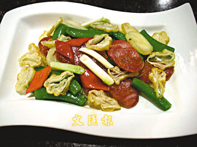 不過,今夜只取一條葡國腸已足矣,動動腦筋,弄個「鬼馬甜豆炒葡國腸」,顧名思義:油炸鬼有之,馬蹄亦有之,再加甜豆一起炒葡香腸,這個菜下酒可以,佐牛油麵包亦可以,好吃好吃。