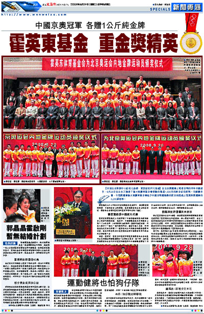 【本報北京新聞中心記者江鑫嫻、實習記者何凡報道】在北京奧運會上奪得金牌的所有中國選手,9月28日在北京又獲得了霍英東體育基金會獎勵的重達1,000克的純金紀念獎牌。從總體來看,今屆奧運會霍英東體育基金會給予中國金牌運動員的獎金將超過上屆雅典奧運會的3,250萬港幣。