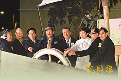 ■今年二月,楊海成(右一)與澳門特首何厚鏵(右四)、何鴻燊(右五)、蘇樹輝(左二)等在澳門十六浦度假村酒店開幕典禮上合影。