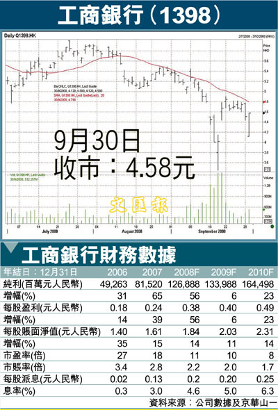 內地雖已開始降息周期,但工商銀行(1398,簡稱工行)是其中一家影響較輕微的內地銀行,原因是該行的貸存比率低及中長期貸款強勁,在短期貸款利率下降較快下,所受的影響較小。另一項刺激工行股價的催化劑,是其大量重組相關的定息債券將會到期,但此正面因素只會在2010及2011年間出現。將評級由買入降至觀望。