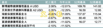 比如近三個月榜首的聯博國際健康護理基金,是透過在全球範圍投資於經營醫療保健及衛生科學業務公司股票,以達致高額增值。基金在2005、2006和2007年表現分別為17.98%、-1.24%及6.82%,基金平均市盈率和標準差為18.94倍及12.38。