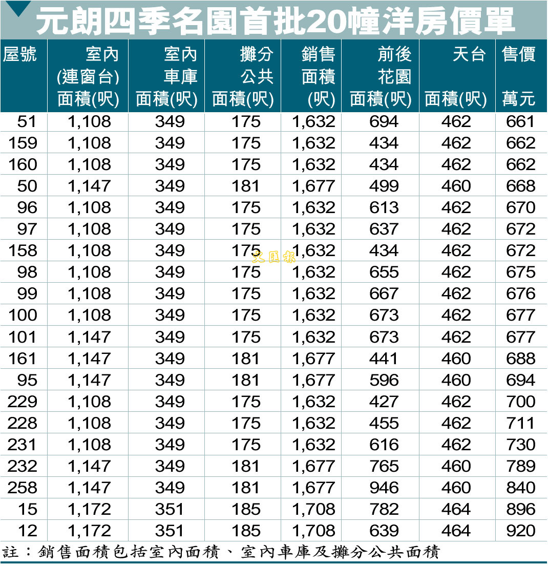 註:銷售面積包括室內面積、室內車庫及攤分公共面積