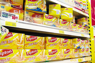■Lipton經銷商表示,由於部分產品驗出含三聚氰胺,宣布回收3款共4批次產品後,部分超市昨午仍有售賣該批次三合一奶茶。 本報記者朱樂汶 攝