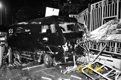 ■一輛解款車,馳至龍翔道時失控撞欄,車頭損毀。