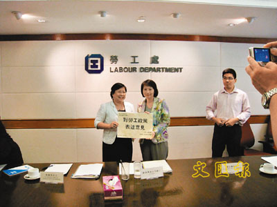 ■九龍社團聯會理事長高寶齡(左)向勞工處處長謝凌潔貞遞交意見書。
