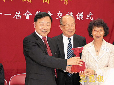 ■交接儀式上,余潔儂會長(右)在陳偉南(中)等見證下由上屆會長劉宗明手中接過商會印信。