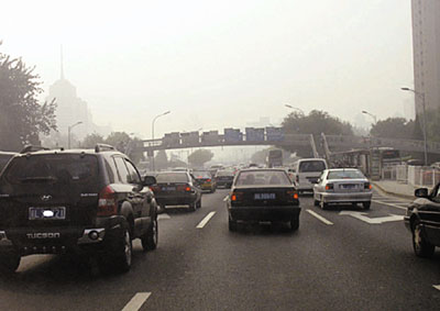 ■車輛在北京濃重的霧氣中緩緩行駛。 網上圖片