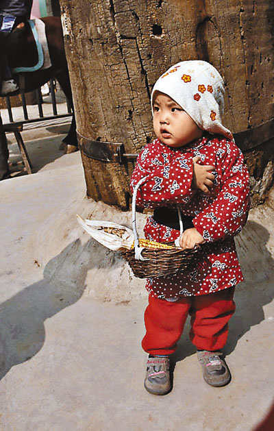 3日,河北保定冉莊地道戰遺址遊人雲集,一小孩遊客打扮成抗擊日本侵略的當地農民模樣拍照。 中新社