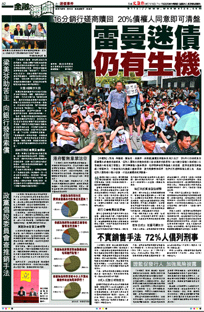 香港目前相關的雷曼迷你債券主要分兩類,其中涉及金額最多的一類是以雷曼作為掉期擔保人的債券,涉款約127億元,這批「迷債」目前仍有一線生存希望。另一類「迷債」是以雷曼作為信貸事件對象,因雷曼破產即信貸事件已發生,按程序必須贖回,此類「迷債」總值約30億元。