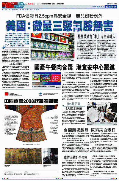 【本報訊】據中央社4日消息:美國食品及藥物管理局(FDA)昨日表示,在經過最新的研究後,他們對嬰兒奶粉無法建立一個他們認為不會引起健康顧慮的三聚氰胺標準。但認為除嬰兒奶粉以外,人體每天攝取低於百萬分之2.5(2.5ppm)的微量三聚氰胺,不會危害健康。