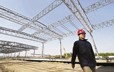 4日,新疆首個無柱風雨棚主體結構在伊寧火車站建成。一名工人在無柱風雨棚下走過。 新華社